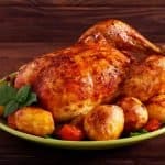 After the first 20 minutes, turn the heat down to 325° F and roast for another 70 minutes or until the thigh meat is 165° F and the juices run clear. (All ovens cook slightly differently, so this cook time may increase or decrease based on the actual temperature of the meat.